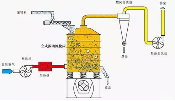 由安裝于主機下部的兩個振動電機同步反向回轉(zhuǎn),使安裝于其上的多層環(huán)狀孔板組成的主機產(chǎn)生垂直振動與扭振,從而使由進料口進入的物料沿水平環(huán)狀孔板自上層向下層連續(xù)跳躍運動。熱空氣則自下層向上層通過各層孔板穿過物料層,達到物料均勻干燥目的。