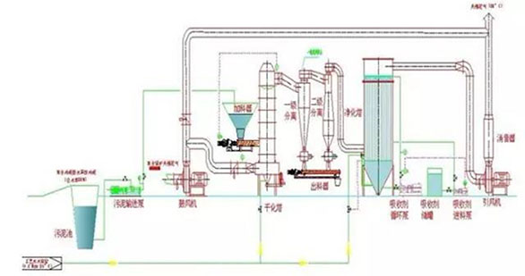 濕物料薄膜在熱載體的內(nèi)部作用下和熱空氣外部作用下迅速完成干燥過程,然后在載體相互之間碰撞下變干的濕物料薄膜脫落并被粉碎。達到一定粒度后,隨干燥尾氣帶出干燥器,由系統(tǒng)后部的除塵設(shè)備收集。