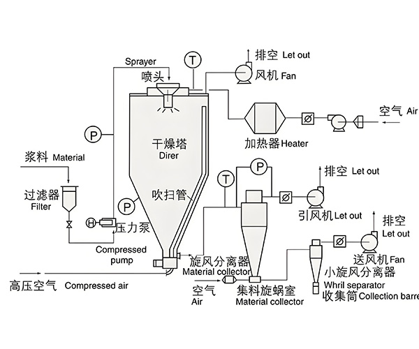 空氣通過加熱器加熱后,經(jīng)送風機進入干燥塔頂部的熱風分配器,通過熱風分配器后,熱空氣均勻的進入干燥塔內(nèi),并呈螺旋狀運動。料泵同時將料液送至干燥塔頂部的離心噴霧器,料液被噴成極小的霧狀液滴。使料液和熱空氣接觸的表面積大大增加,水份迅速蒸發(fā),在極短時間內(nèi)干燥為干品。干品由旋風分離器與濕空氣分離,經(jīng)旋風分離器底部的集料旋蝸室由干燥的空氣送至小旋風分離器分離,并收集在收料筒,尾氣經(jīng)引風機排出。 干燥機的熱風系統(tǒng)、吹掃系統(tǒng)、風送系統(tǒng)均配有初效、中效、亞高效等過濾器,凡進入干燥系統(tǒng)的風都經(jīng)過濾處理。凡與物料接觸部位均采用不銹鋼制作,符合GMP要求。