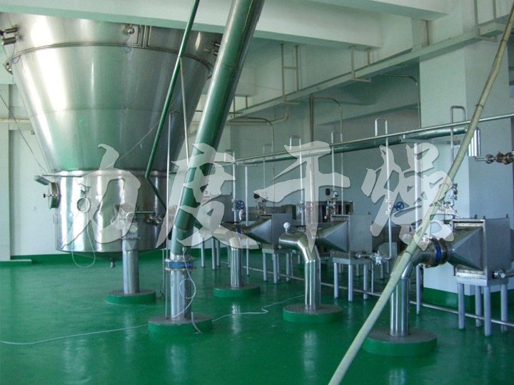 該生產線由供料系統、介質循環系統、空氣加熱凈化系統、干燥塔系統、收料系統、控制系統等多個系統整合而成。主塔系統集中了目前噴霧干燥工程的所有尖端技術,噴干機組的收料系統由一級旋風分離器+布袋除塵器組合形成。一級旋風采用高氣量高效率旋風進行收集,其收粉率能達到96%左右分,而布袋除塵器是針對蛋白粉類除塵專門設計的優化設備,能使物料與風進行完全分離并沉降,布袋為拒水防油防靜電布袋,過濾目數可達500目以上。